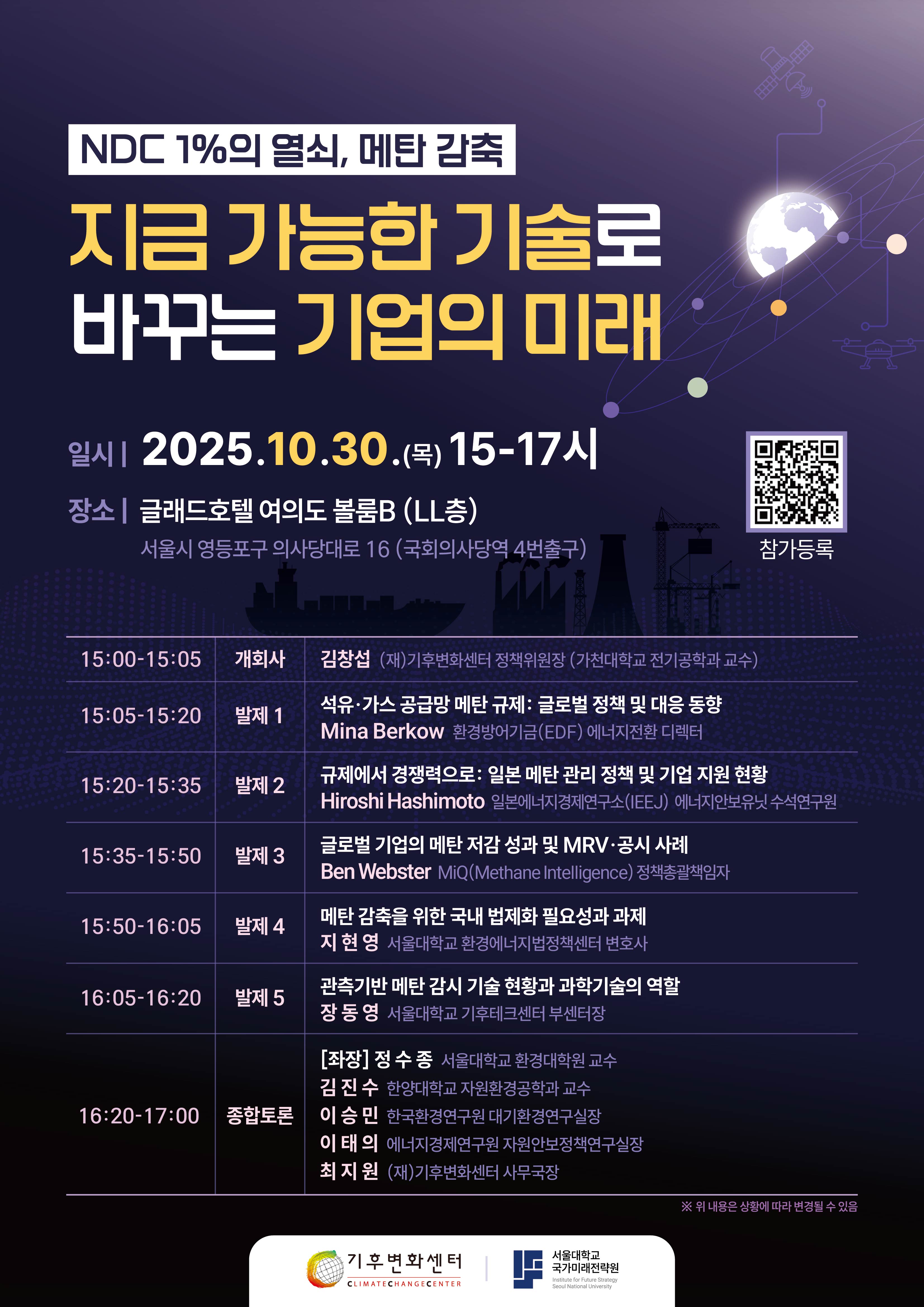 오는 10월 30일, (재)기후변화센터와 서울대학교 국가미래전략원은 「NDC 1%의 열쇠, 메탄감축: 지금 가능한 기술로 바꾸는 기업의 미래」 를 개최합니다.🌐