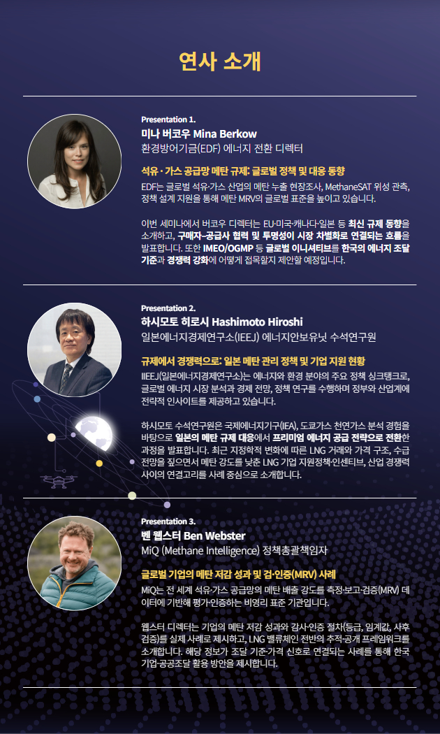각 세션에서는 🌏글로벌 메탄 규제 동향부터 해외 감축 사례, ⚖️국내 법제화 방향, 🔬감시·저감 기술 혁신에 이르기까지 다양한 관점에서 메탄 감축의 실행 전략과 산업·정책적 해법을 살펴봅니다.