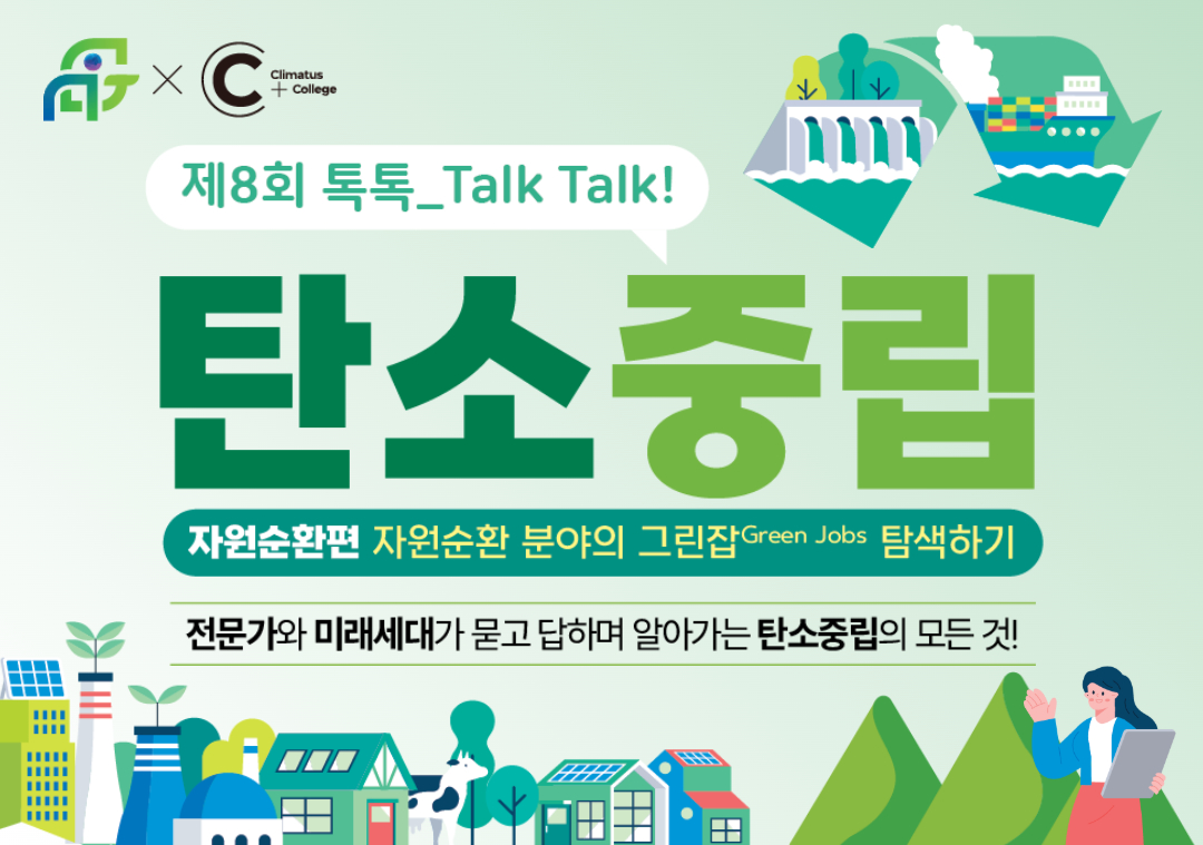 지난 10월 28일, ‘자원순환’과 ‘그린잡(Green Jobs)’을 주제로 열린 「제8회 톡톡_TALK, TALK! 탄소중립」은 🎓미래세대와 👨🏫전문가가 함께 일의 의미를 다시 묻고, 탄소중립 사회로 전환하기 위한 새로운 길을 찾아간 시간이었습니다.