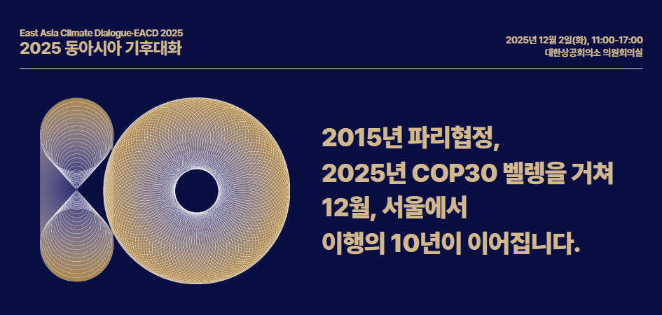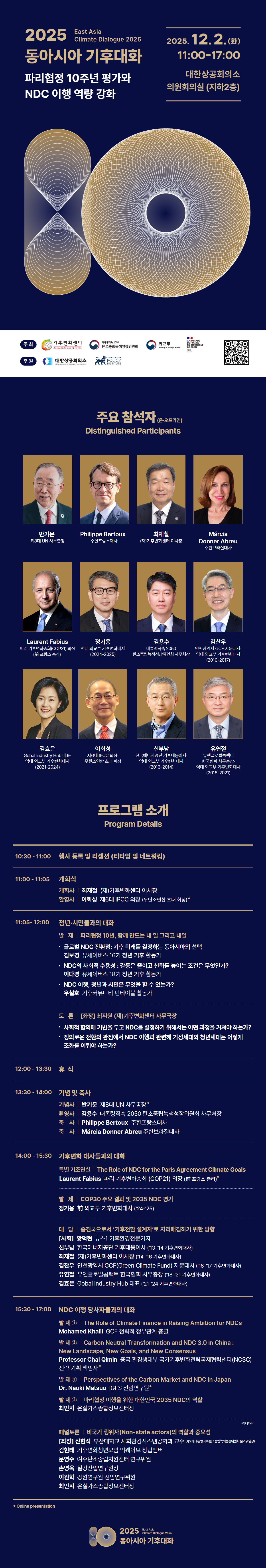 (재)기후변화센터는 내일, 12월 2일(화) 대한상공회의소(B2)에서 2050탄소중립녹색성장위원회, 외교부, 주한프랑스대사관과 함께 「2025 동아시아 기후대화 – 파리협정 10주년 평가와 NDC 이행 역량 강화」를 개최합니다. 파리협정 채택 10주년과 COP30 이후 상향된 2035 NDC 시대의 개막은, 동아시아가 국가 간 온실가스 감축 목표(NDC) 이행, 탄소시장 활용, 산업 전환, 지역·도시 협력, 기후재원 동원 등 실제 이행 과제를 공동으로 추진할 ‘협력체계’를 구축해야 한다는 필요성을 크게 높이고 있습니다.