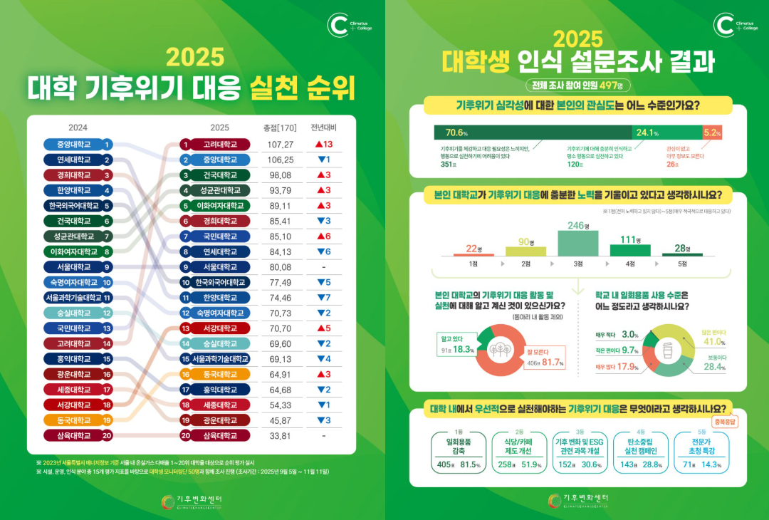 ‘캠퍼스 일상에서 기후대응이 실제로 작동하는가’를 핵심 기준으로 삼아 ✨대학의 제도와 현장 실행력을 함께 확인한 결과, 상위권 대학들은 기본 인프라와 행정 대응체계, 정보 공개와 참여 기반을 안정적으로 확충해 실질적 성과를 보여준 반면, 일부 대학은 구조적 기반에서 개선이 필요한 것으로 확인되었습니다.