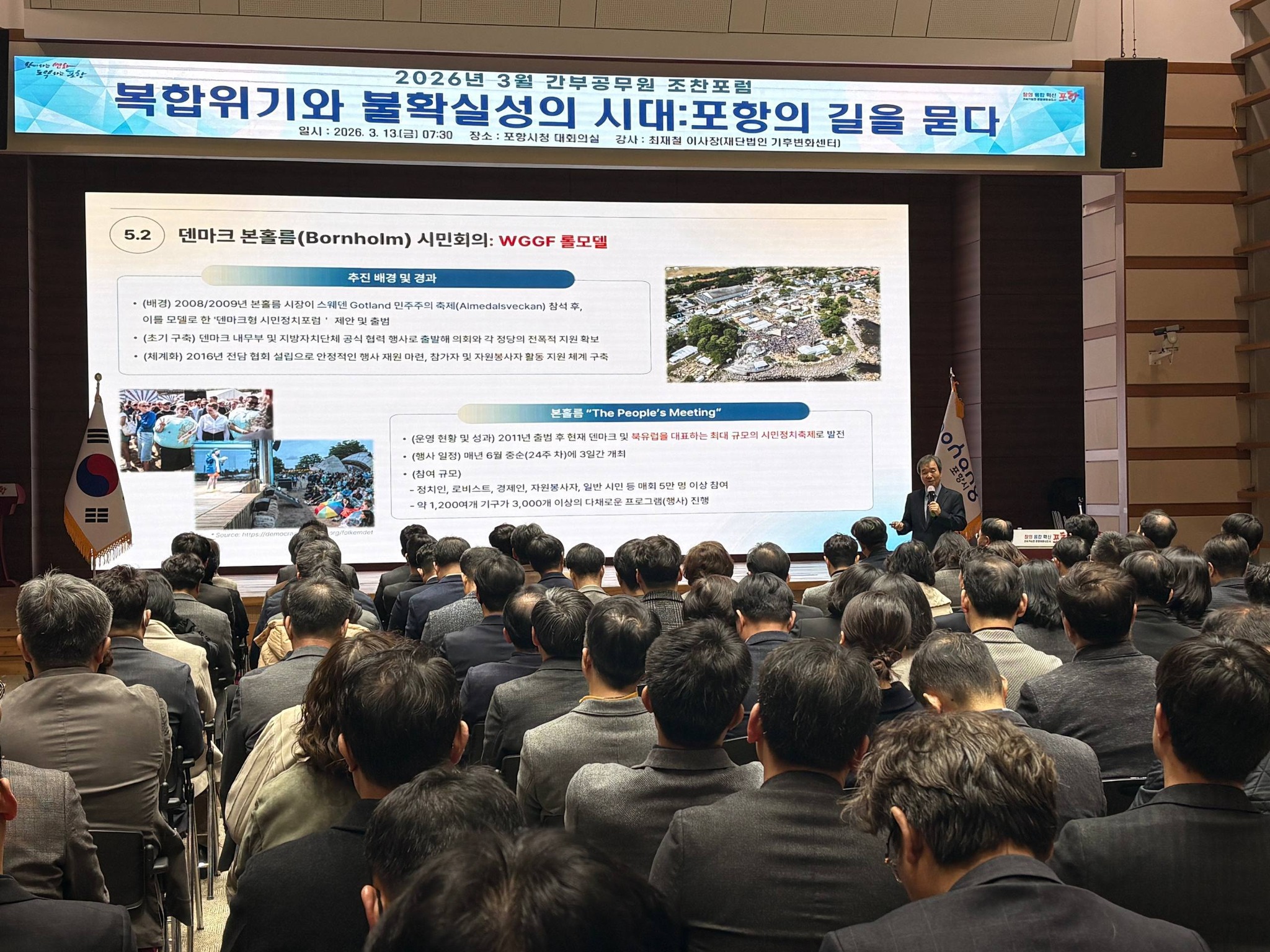 3์ 13์ผ, ์ต์ฌ์ฒ ์ด์ฌ์ฅ์ ํฌํญ์์ฒญ์์ ์ด๋ฆฐ ๊ฐ๋ถ ๊ณต๋ฌด์ ์กฐ์ฐฌํฌ๋ผ์ ์ฐธ์ํด โ๋ณตํฉ์๊ธฐ์ ๋ถํ์ค์ฑ์ ์๋: ํฌํญ์ ๊ธธ์ ๋ฌป๋คโ๋ฅผ ์ฃผ์ ๋ก ๊ฐ์ฐ์ ์งํํ์ต๋๋ค. ์ด๋ ๊ฐ์ฐ์๋ ํฌํญ์ ๊ฐ๋ถ ๊ณต๋ฌด์ 100์ฌ ๋ช